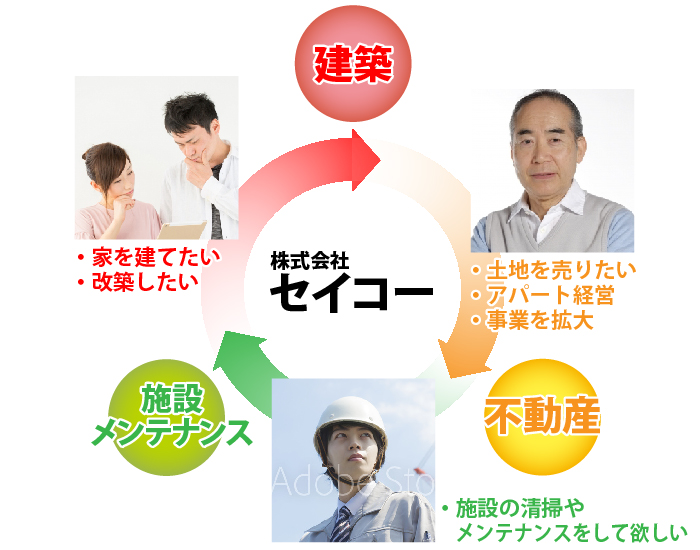 株式会社セイコーの理念は、1つ1つが独立した部門(業務)であっても総合精神の元、他の部門に役立てる情報を得られる行動をすることです。不動産・建築・カーディーラーの仕事はそれぞれが違った業務ではありますが、皆様の生活の基盤となる大切な資産となります。不動産・建築・車を通じて、お客様の資産を守り、活かし、育てて大きくします。専門のスタッフと長年の経験、そして地元密着だからできる情報など、よりよい生活基盤となる安全で安心の未来を創造し、皆様へご提供いたします。